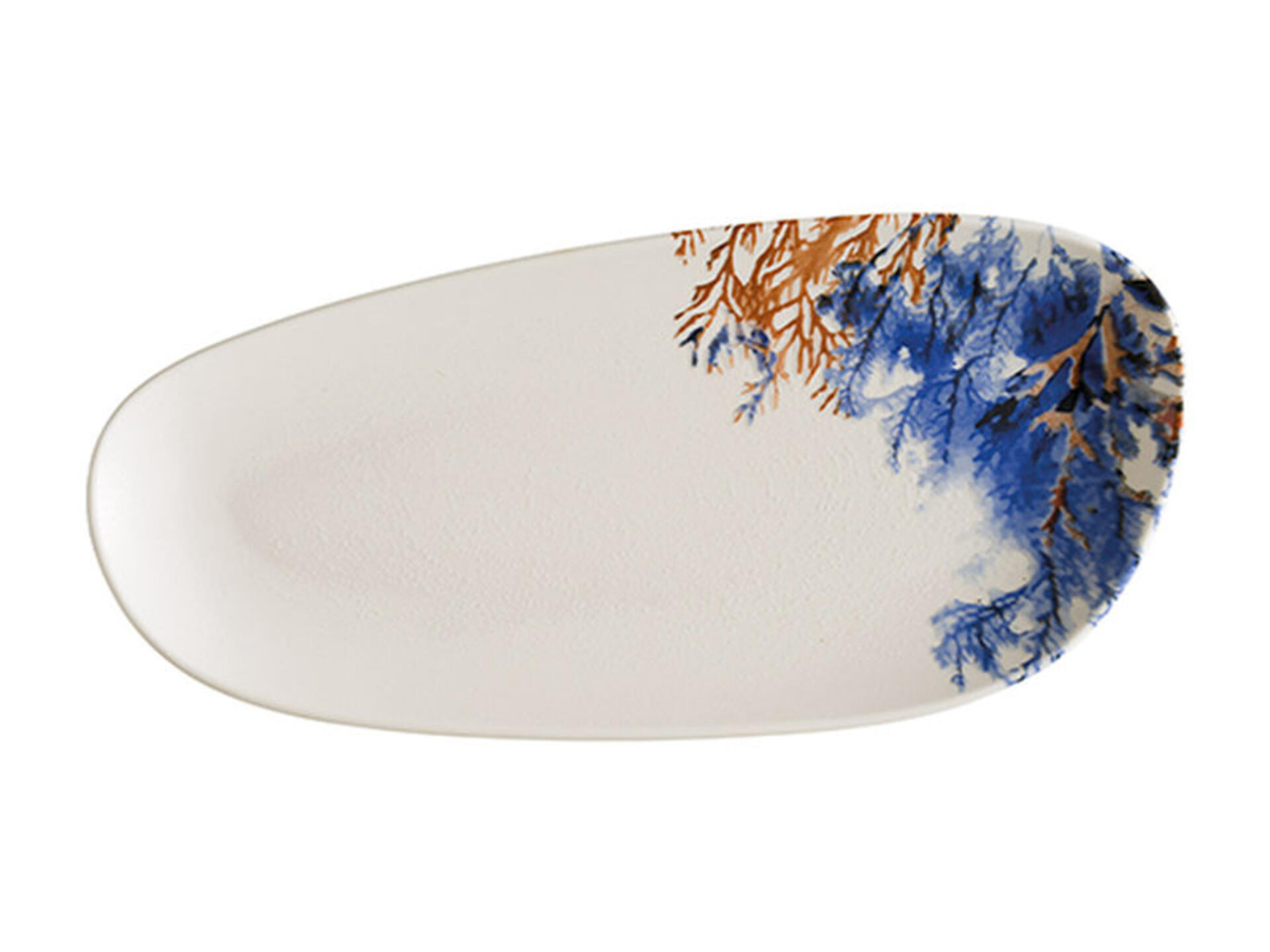 piatto rettangolare della linea aquelis realizzato con tecnologia fusiontech, che combina profondità eccezionale e contrasti elevati per una presentazione di grande impatto. la superficie si distingue per la fusione di finiture opache e lucide che danno vita a motivi ispirati alla natura, richiamando elementi corallini in tonalità blu e ocra. la forma vago, caratterizzata da linee morbide e asimmetriche, offre una tela dinamica e testurizzata per la "mise en place" creativa. progettato per resistere ai ritmi intensi del settore horeca e luxury, questo articolo garantisce una durabilità superiore nel tempo. prodotto idoneo al lavaggio in lavastoviglie professionale.